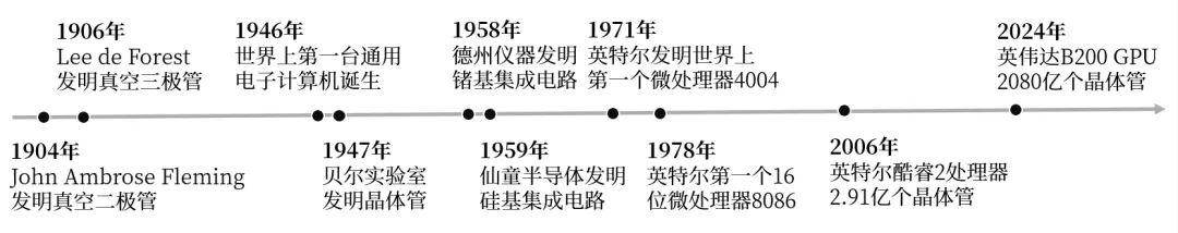AI的发展离不开芯片,没有芯片的快速发展,没有算力的支持,AI的时代就不会这么快到来。那AI又如何助力芯片的发展呢?现如今已有不少研究者将AI应用到芯片的设计中,AI与芯片相辅相成,AI也在促进芯片的发展,芯片的进一步发展又可以加速AI的发展,由此,AI与芯片形成了一个闭环迭代之路,双向驱动,照这样发展下去,难以想象未来科技的进步之快。芯片产业的链路是很长的,从上游的半导体材料和设备,到芯片设计、制造、封装、测试,再到下游的产业应用。随着人工智能的发展,智能汽车、智能手机、AI PC、大模型等领域对芯片的需求急剧增长,特别是npu、gpu等AI芯片,算法的输入需要图像、点云等模态的数据,因此需要相机、激光雷达等传感器采集数据,这也加大了对各类传感器芯片的需求。在过去,芯片的研发过程是很长的,需要专业的芯片工程师反复设计验证,才能让一款芯片落地,周期达几年。一个芯片设计工程的成长也是很漫长的,需要学习大量的理论,并且在实践中不断地磨炼。在芯片发展的早期,芯片设计主要用手工绘制,随着芯片越来越复杂,晶体管数量也越来越多,如今的芯片极其复杂,芯片中已经多达百亿晶体管,需要软件工具辅助设计。因此诞生了EDA软件,EDA被称为芯片之母,现在都是用EDA设计芯片,EDA软件中集成了大量的算法。如今,AI已经可以应用于芯片设计的多个环节,能够极大提升芯片设计的效率,例如AI RTL代码生成、AI辅助验证、AI布局布线、AI设计空间探索、AI全自动设计芯片。EDA在全球的市场规模约100亿美元,但它支撑着数十万亿美元的数字经济。本文将沿着时间的脉络带大家走进芯片的世界,了解芯片的发展历程、EDA的发展历程以及AI EDA的发展历程,这是科技发展史上所不可或缺的一部分。芯片的发展历程芯片的发展经历了真空管(电子管)时代、晶体管时代、集成电路时代、大规模集成电路时代、超大规模集成电路时代。